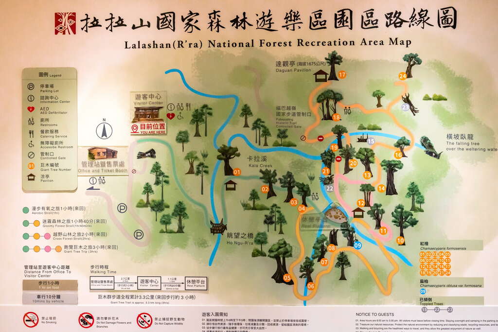 Walk on the gravel road for about 700m from the Lala Mountain Ecology Center parking lot, you will see the 1400-year-old, 41m-tall giant tree No. 1. With a circumference of 9.8m, it takes 5 adult hand-in-hand to wrap around it. Its greatness standing the test of time is also achieved by time. After the first greet-and-meet, you will look forward to the next encounter. Continuing on the trail, you will see giant trees No. 2 and No. 3 standing tall on a slope with great strength and beauty. Next to giant tree No. 4 there is some space for you to take a break next to the flowing creek water and birds singing to recover from the exhaustion from hiking. After the break, turn right and take the stairs up to visit the trees in order. If you turn left here and go to the end of the path, you will reach the giant tree No. 5, with a natural tree hole at the bottom. Standing in front of a 1,495-year-old tree will surely humble you.