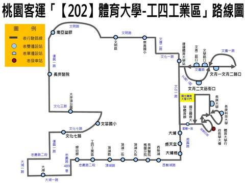 因應機場捷運通車,本府交通局規劃202線「體育大學-工四工業區」公車(桃園客運營運),沿途行經南亞科技公司、林口長庚醫院、龜山工業區、長庚醫院桃園分院、體育大學、長庚科技大學等站,從早上六點至晚間九點行駛,每日皆有22班次,目前已正式上路,此新設路線可望增加民眾通勤、就醫之便利性。