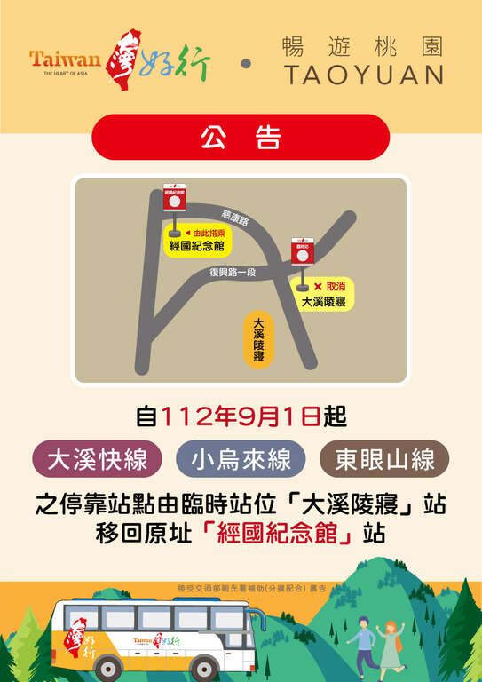 桃園市台灣好行大溪快線、小烏來線及東眼山線自112年9月1日起開始停靠「經國紀念館」站,不再停靠原臨時站位「大溪陵寢」站。