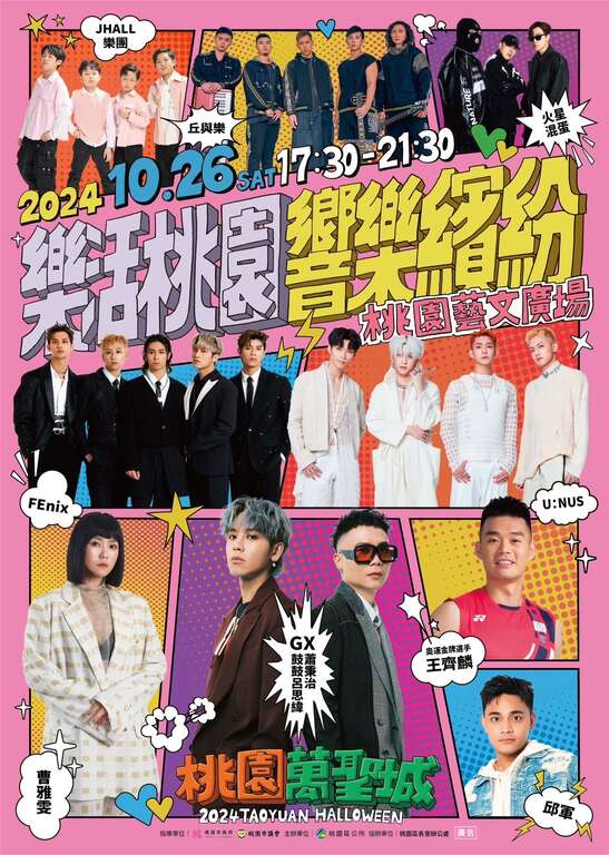 「2024桃園萬聖城─搗蛋鬼學院」於10月26日至11月3日在桃園藝文廣場盛大舉行!首日晚間「樂活桃園-響樂繽紛」開城演唱會GX 鼓鼓呂思緯蕭秉治、曹雅雯、U:NUS、FEniX、火星混蛋、丘與樂、邱軍,以及奧運金牌選手王齊麟輪番登場!