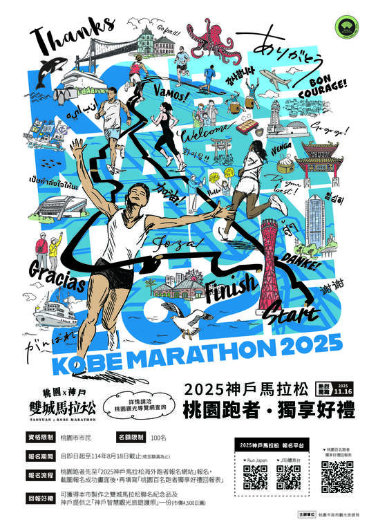 2025神戶馬拉松預計於114年11月16日舉行,即日起至8月18日止(或額滿為止),桃園市民可擇一透過以下兩個網站自費報名參賽: