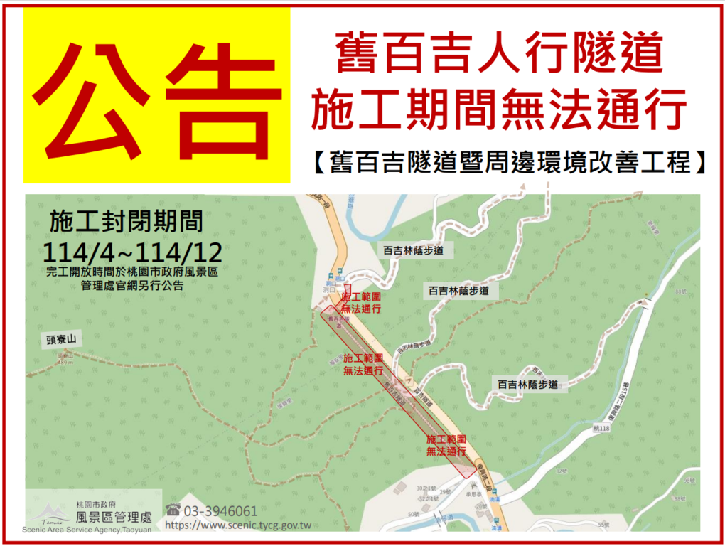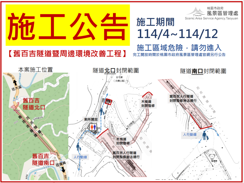 本處辦理「舊百吉隧道暨周邊環境改善工程」,已於114年4月21日開工,將於114年7月10日起調整施工範圍封閉「舊百吉人行隧道」南北口及「隧道北口高架木棧道」整修,並開放隧道北口整修完成之廁所供大眾使用(工區管制範圍及施工位置如附圖)。