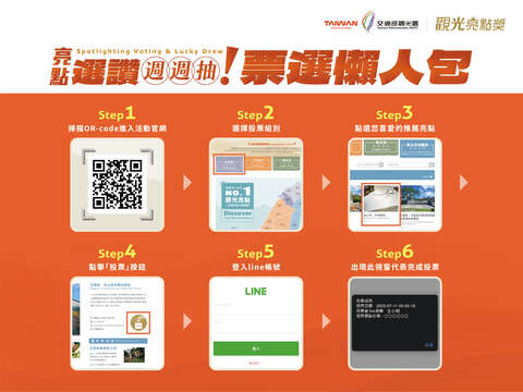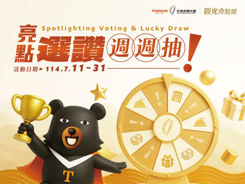 投票活動自114年7月11日至7月31日,只要登入LINE帳號,即可每天投票支持您最喜愛的觀光景點,每組可各投2票,每投1票即享1次抽獎機會,投愈多,中獎機會愈大!有機會抽中總價值30萬元的觀光旅遊好禮!每週進行1次抽獎,活動期間共計3波抽獎機會,投得越多,中獎機會越高!