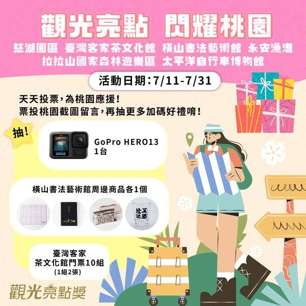 為鼓勵更多民眾參與,桃園市政府觀光旅遊局也同步於官方社群平台「樂遊桃園」推出加碼抽獎活動,凡完成投票並依指定方式參與社群互動(按讚、追蹤並於留言區貼出投票截圖及標註2位好友),就有機會再抽出桃園限定觀光好禮。本次加碼好禮包括運動相機、臺灣客家茶文化館門票、橫山書法藝術館精美周邊商品等多項驚喜!