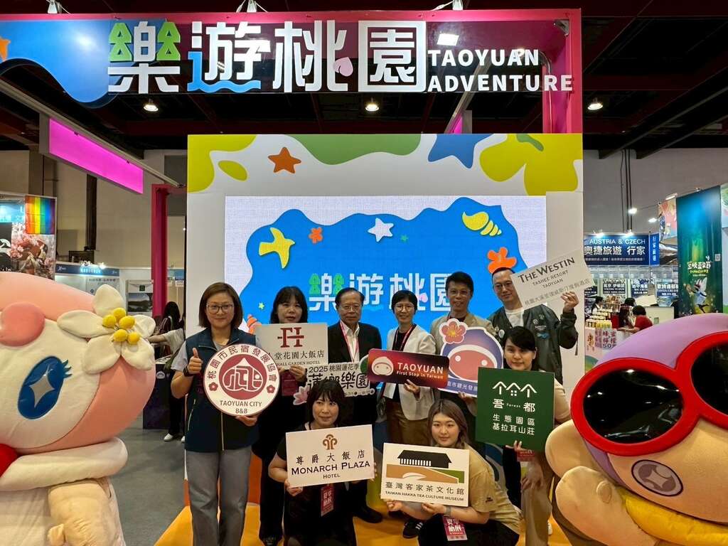桃園館同步規劃系列互動體驗活動,讓民眾在參觀旅展的同時,也能深入感受桃園觀光的多元魅力,現場推出「集章任務」,民眾可憑集章卡完成指定任務,即可兌換神秘小禮和77巧克力共和國觀光工廠的免費入場券(期限至114年12月31日),還有結合桃園吉祥物的體感互動遊戲「ㄚ桃園哥拯救任務」,以趣味方式吸引大朋友小朋友一同挑戰!此外,也邀請在地達人分享手作課程,可以品嘗到蓮花園休閒農業區的荷葉包飯、帶走坑子溪休閒農業區的松果彩繪以及臺灣客家茶文化館的茶球,讓民眾親身體驗桃園的在地風情!