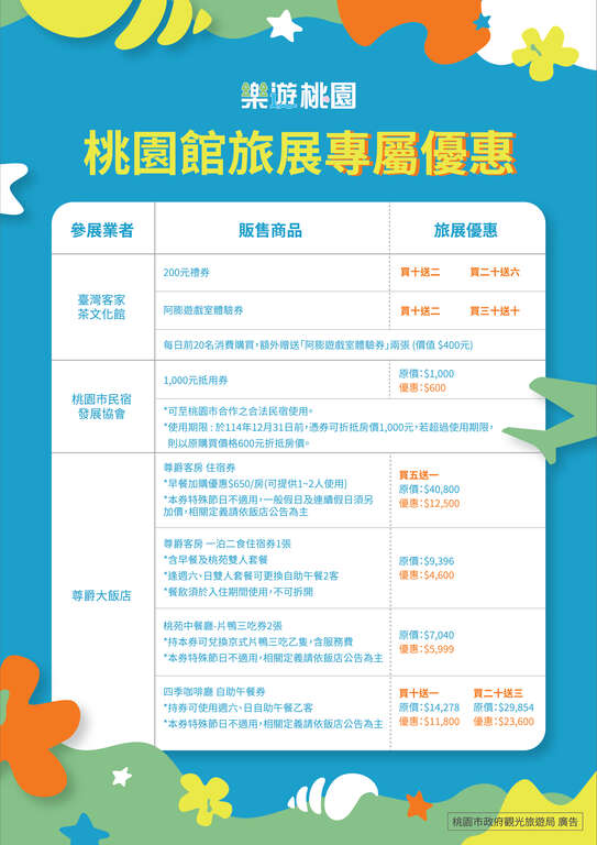 為搶攻暑假親子家庭旅遊市場,桃園參展業者推出經濟實惠的方案,無論是大家庭還是小家庭都能依需求靈活搭配,「臺灣客家茶文化館」提供現金禮券買十送二、買二十送六,還有阿膨遊戲室體驗券買十送二、買三十送十,且每日前20名消費者再加贈阿膨遊戲室體驗券2張;「桃園市民宿發展協會」推出1000元住宿抵用券,旅展現場優惠價只要600元;「尊爵大飯店」則是推出多元餐宿優惠,一泊二食住宿券下殺五折、客房住宿券買五送一、桃苑中餐廳片鴨三吃券2張近85折優惠、四季咖啡廳自助午餐券買十送一、買二十送三。優惠內容豐富又實用,來趟桃園一次搞定「吃、住、玩」全方位旅遊需求!