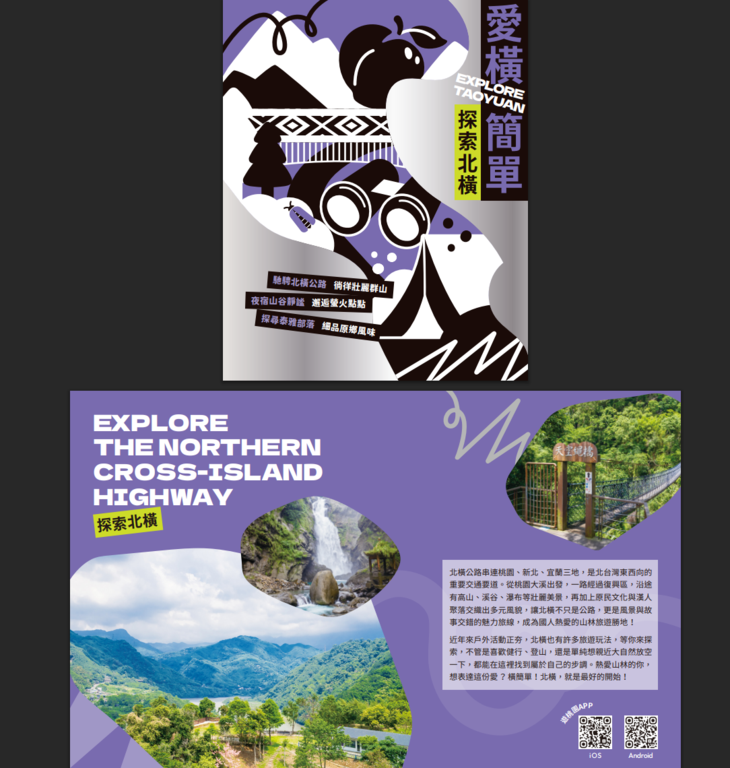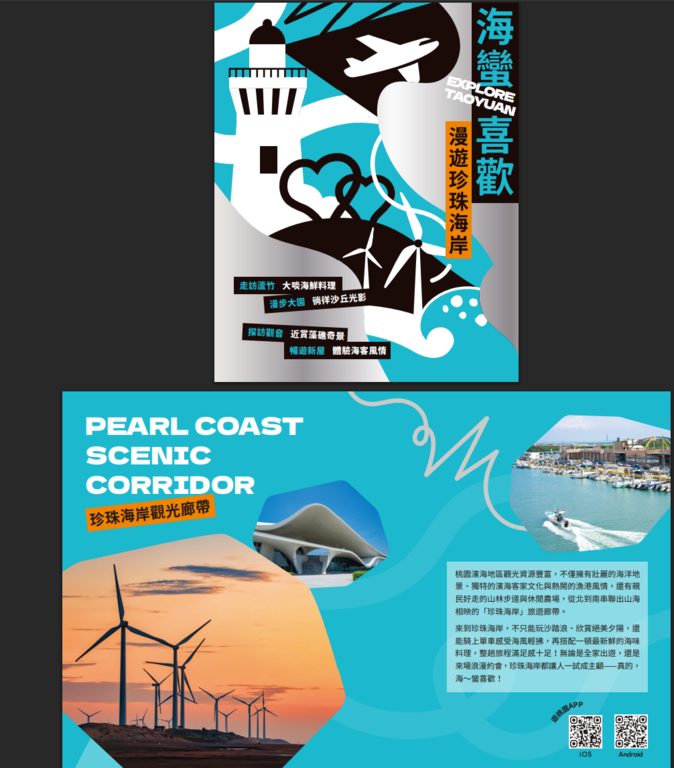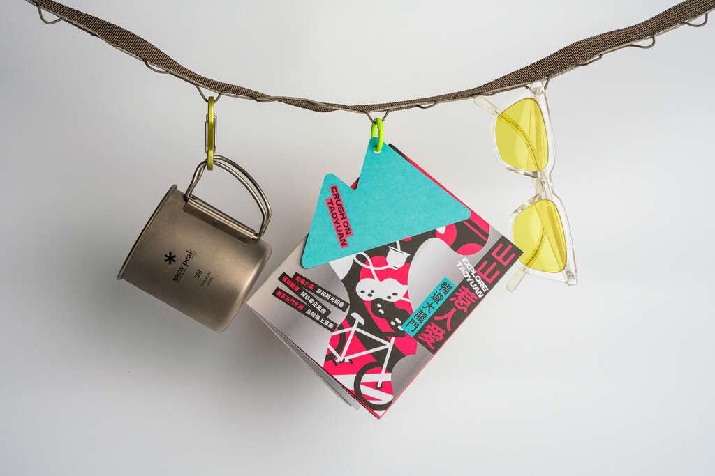 桃園市政府觀光旅遊局表示:本次五款觀光摺頁跳脫傳統文宣形式,創新導入「潮流掛飾」概念,每款摺頁皆搭配專屬造型吊卡,包括碗公、小魚、山峰、公路與雲朵等造型,象徵各自代表的旅遊主題風格。整體視覺設計以幾何拼貼與大膽色塊呈現,不僅吸睛有型,也讓旅遊摺頁搖身一變成為年輕人喜愛的旅遊穿搭配件,兼具實用性與收藏價值。