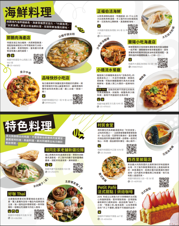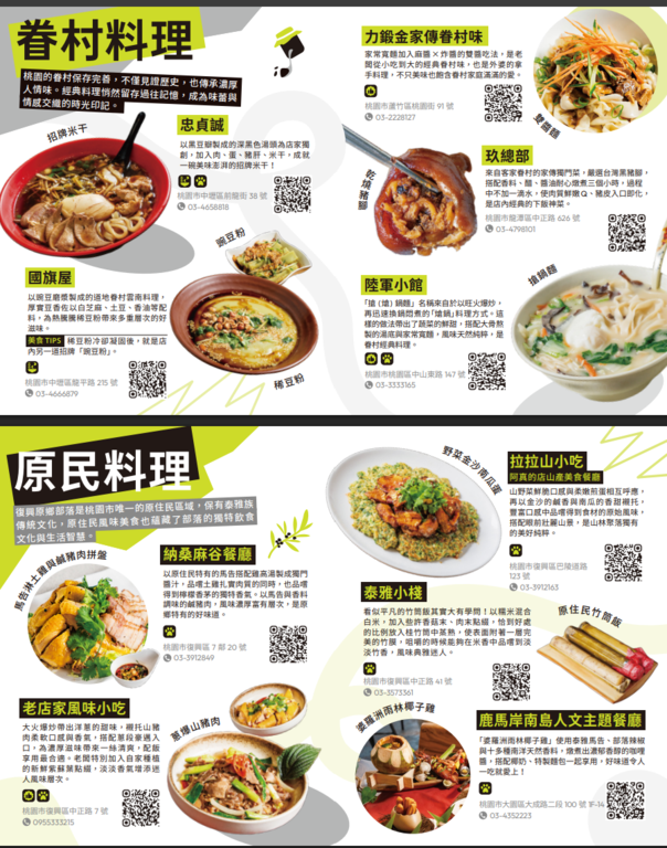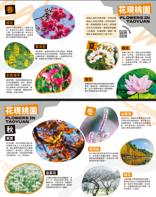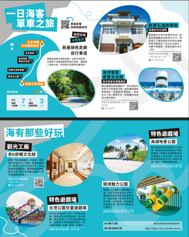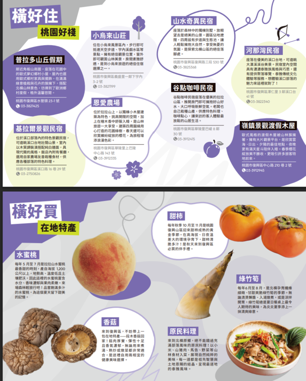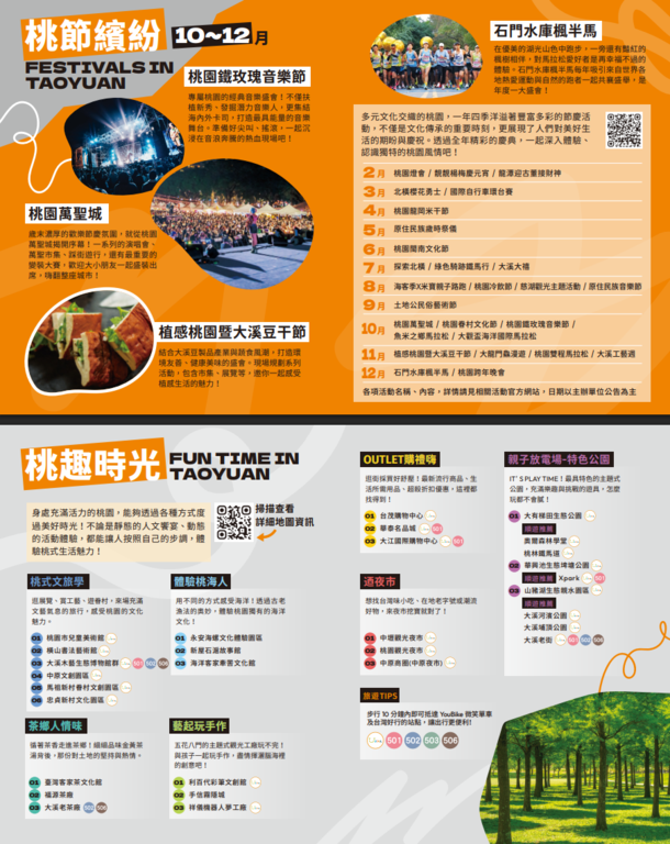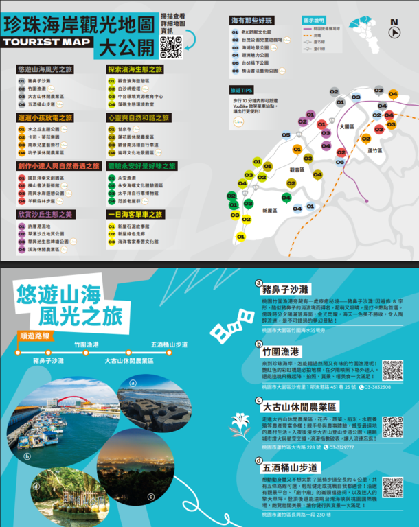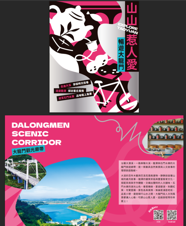 五大主題摺頁分別為【吃吃的愛–打卡桃園美食】、【山山惹人愛–暢遊大龍門】、【愛橫簡單–探索北橫】、【海蠻喜歡–漫遊珍珠海岸】、【桃人喜歡–旅遊體驗】。內容集結旅遊景點、美食亮點與各式旅遊體驗推薦等資訊,也標註YouBike站點與台灣好行路線,鼓勵民眾以低碳方式暢遊桃園,同時亦精選多條自行車遊程,推薦旅客以輕鬆步調騎遊桃園,細細品味山海風光與在地風情。