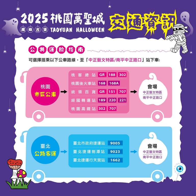 民眾可於桃園火車站、統領百貨轉乘 GR、151、168、188、302、707 號等公車路線,至「中正藝文特區」、「南平中正路口」站牌下車前往會場;經國轉運站方向有189、220、302 和 707 等路線可抵達萬聖活動會場;外縣市搭乘高鐵前來的遊客們也可以在高鐵桃園站轉乘302及707前往會場,再次鼓勵大家不妨變裝上公車,讓公車上的乘客為您的打扮投以驚喜又驚嚇的眼光吧!,相關公車動態請上桃園公車動態資訊系統(https://ebus.tycg.gov.tw/ebus/)。