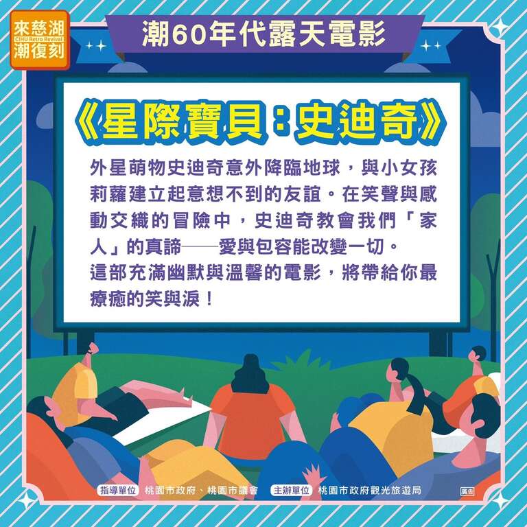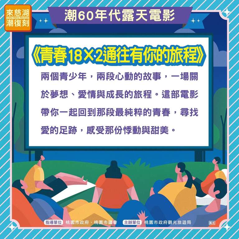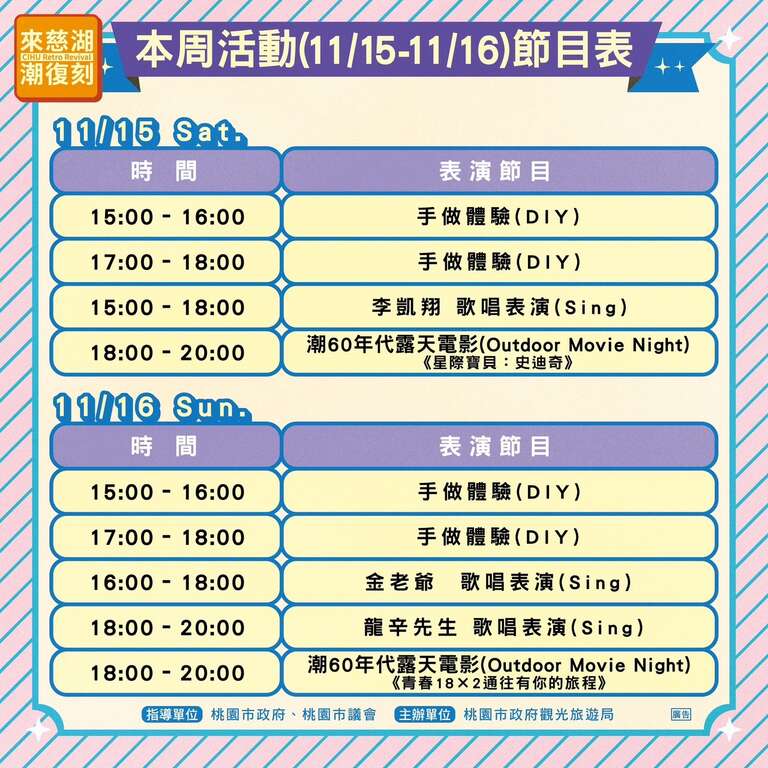 「來慈湖 潮復刻」活動之「光環境」、「音樂光雕」及「日夜水舞」自11月13日起恢復展演至11月18日,本週末15、16日「潮60年代露天電影院」將依原定規劃如期舉辦。
