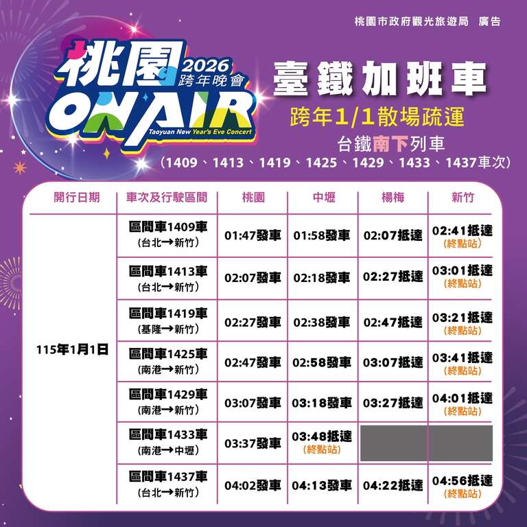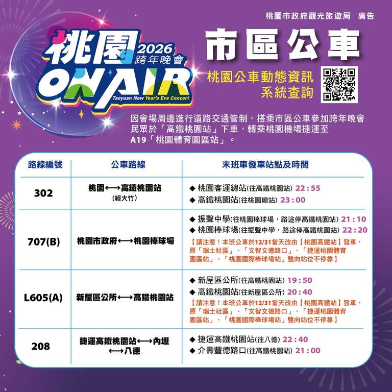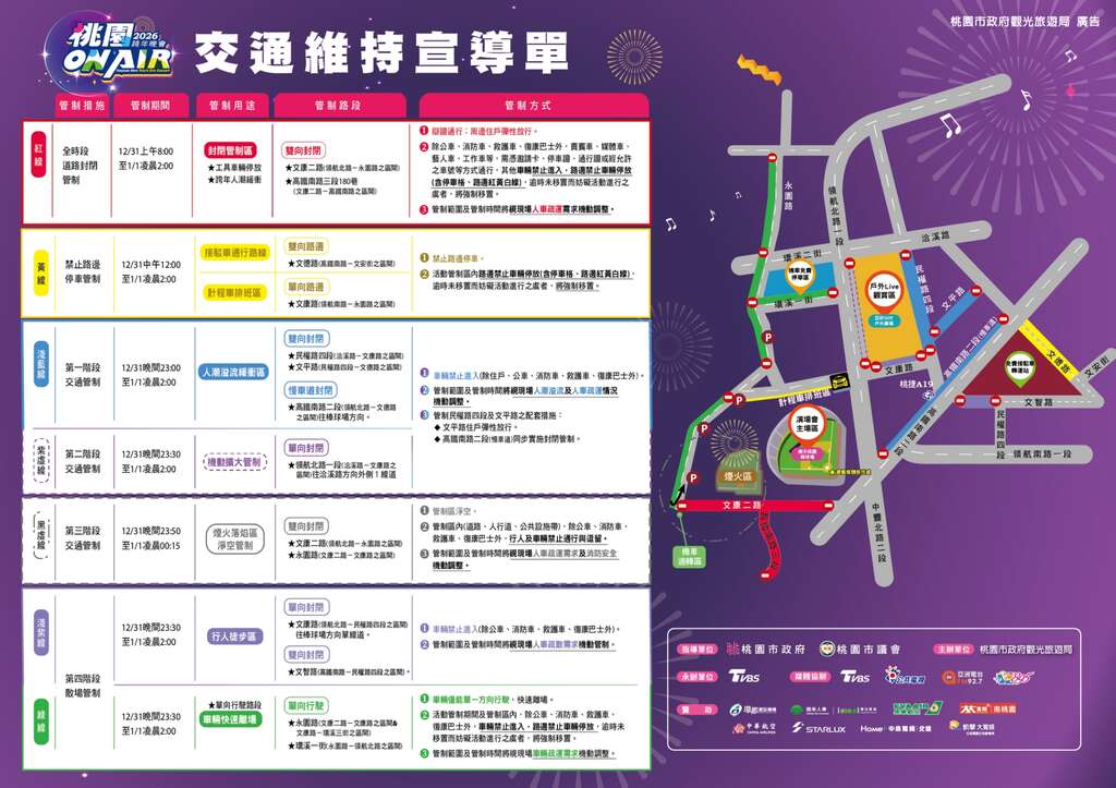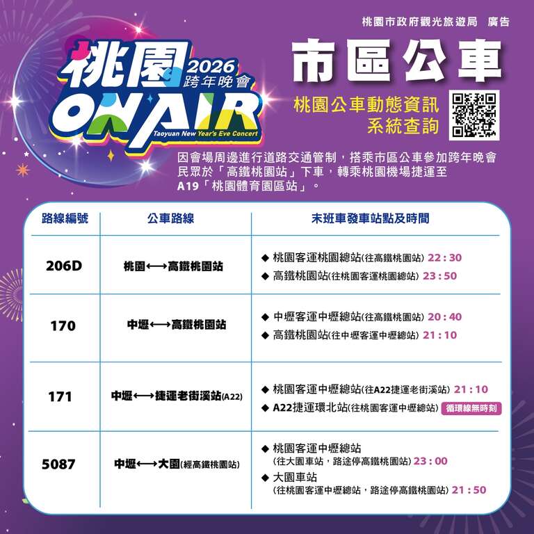 活動當日會場周邊交通管制與疏運詳細資訊,請民眾出發前至「2026桃園ON AIR跨年晚會」活動官網 ( https://www.2026taoyuannewyear.com.tw/ ) 或「樂遊桃園」Facebook官方粉絲專頁查詢最新消息;晚會也將透過多元平台同步轉播,歡迎無法到場的民眾線上共襄盛舉,一起感受桃園ON AIR歡樂氣氛,迎接2026新年到來。