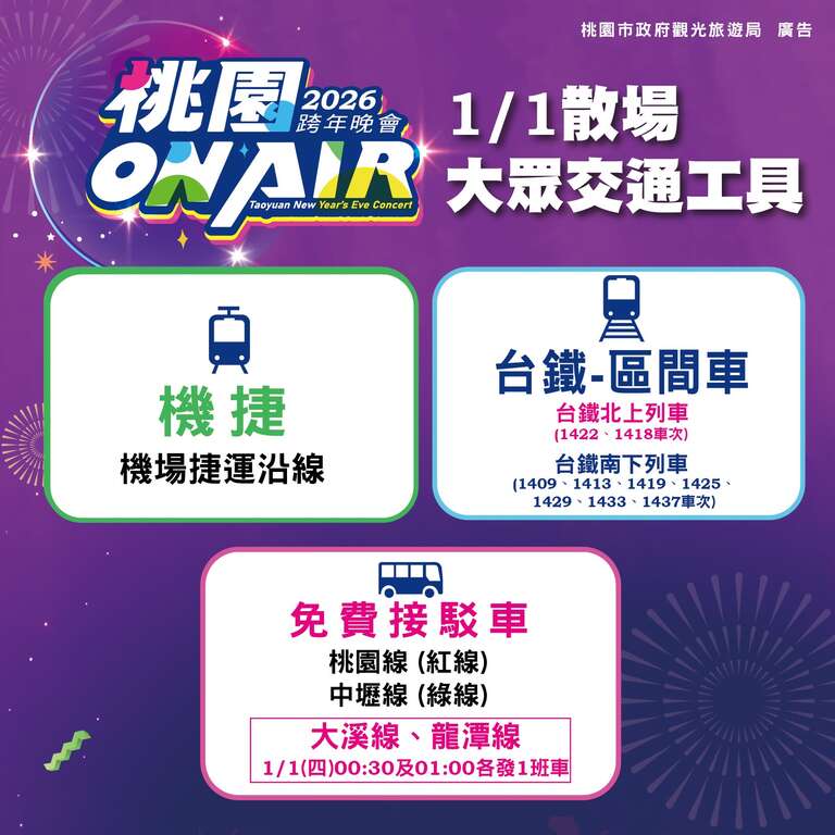 活動當日除了桃園機場捷運將提供41小時不收班服務,還將開設免費接駁車服務,包含桃園線(紅線:桃客桃園總站-桃園區延平路28號搭乘)及中壢線(綠線:桃客中壢總站-中壢區中正路51號搭乘),往返跨年接駁車轉運站,提供民眾快速抵達會場及返家的交通選擇。散場時段(1月1日00:30及01:00)另加開大溪線(藍線:接駁車轉運站-桃園火車站,再沿5096路線站點停靠-桃客大溪站)及龍潭線(黃線:接駁車轉運站-桃客中壢總站-(走中豐路)-桃客龍潭站)免費接駁車,並協調台鐵加開或延後班次,全面分散返程人潮;同時,機場捷運優化站內疏散動線,確保人流順暢安全。