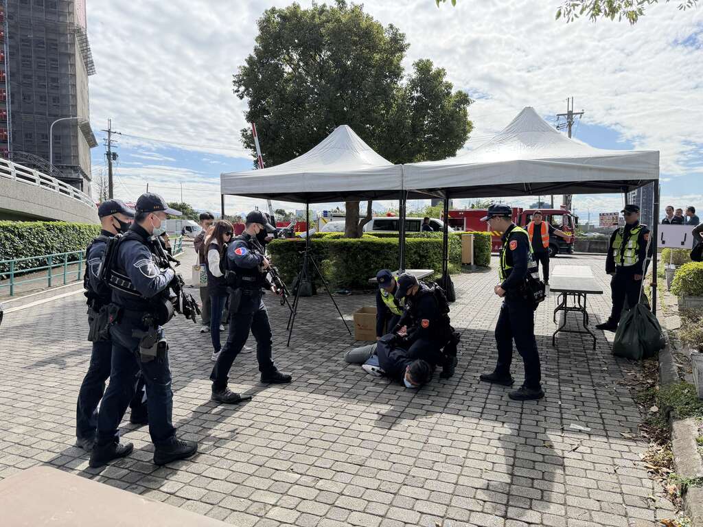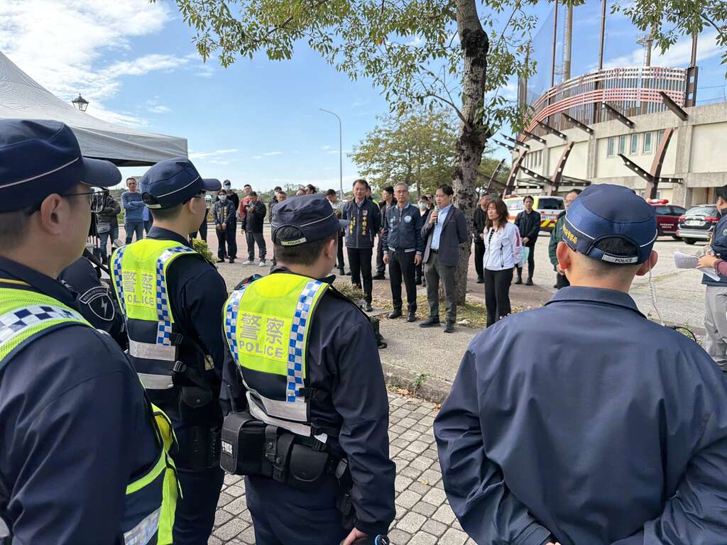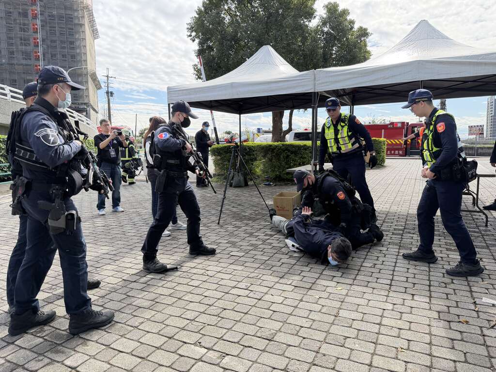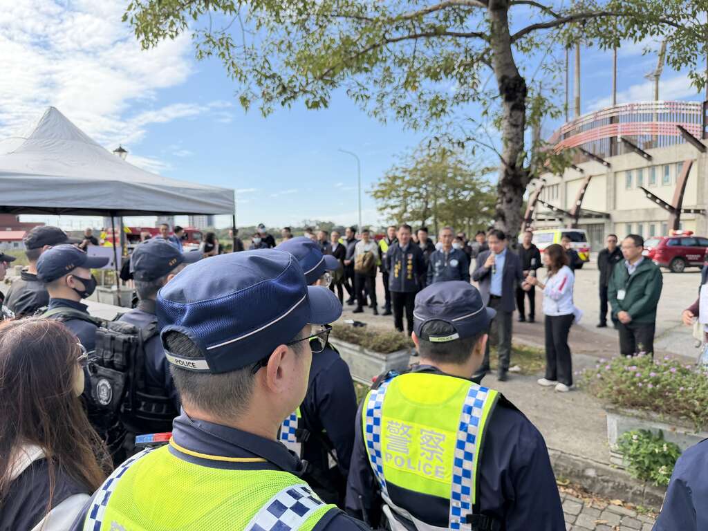 演練過程中,模擬民眾於入場安檢時攜帶管制物品,並出現情緒激動、拒絕配合檢查等情境,現場安檢人員立即通報警力支援,警方隨即依標準作業程序進行管束、隔離人群並排除危害;同時結合警犬隊進行可疑物品檢測,霹靂小組迅速進場待命,全程分工明確、應變迅速,充分展現警政單位即時處置與跨機關協調能力。
