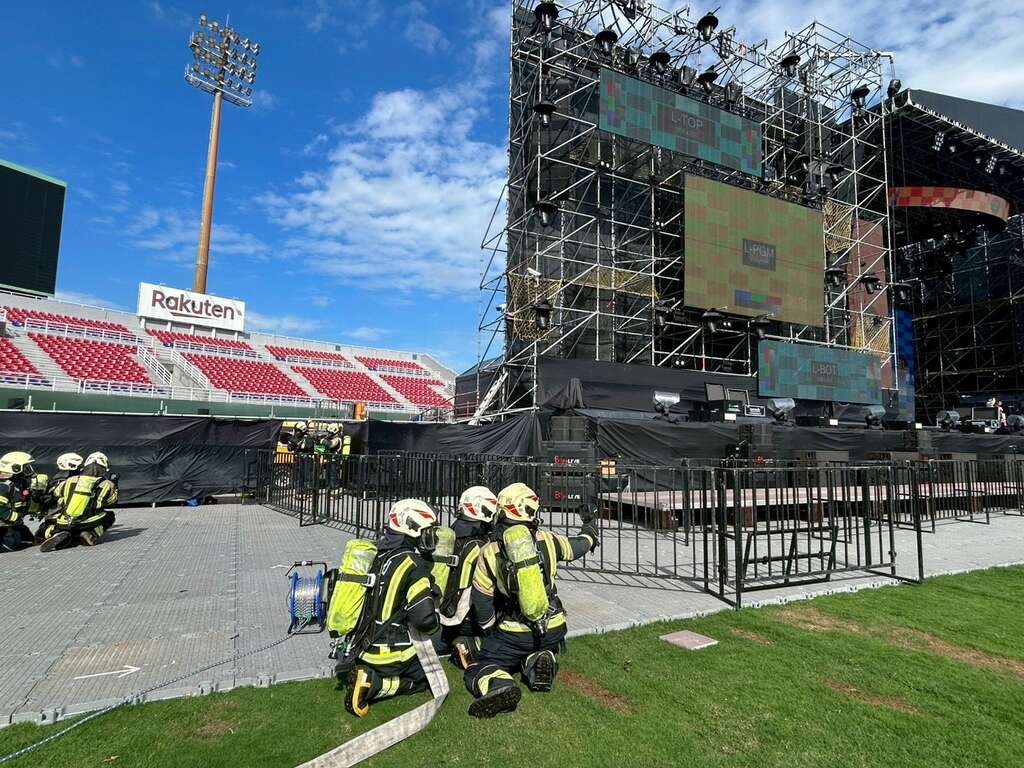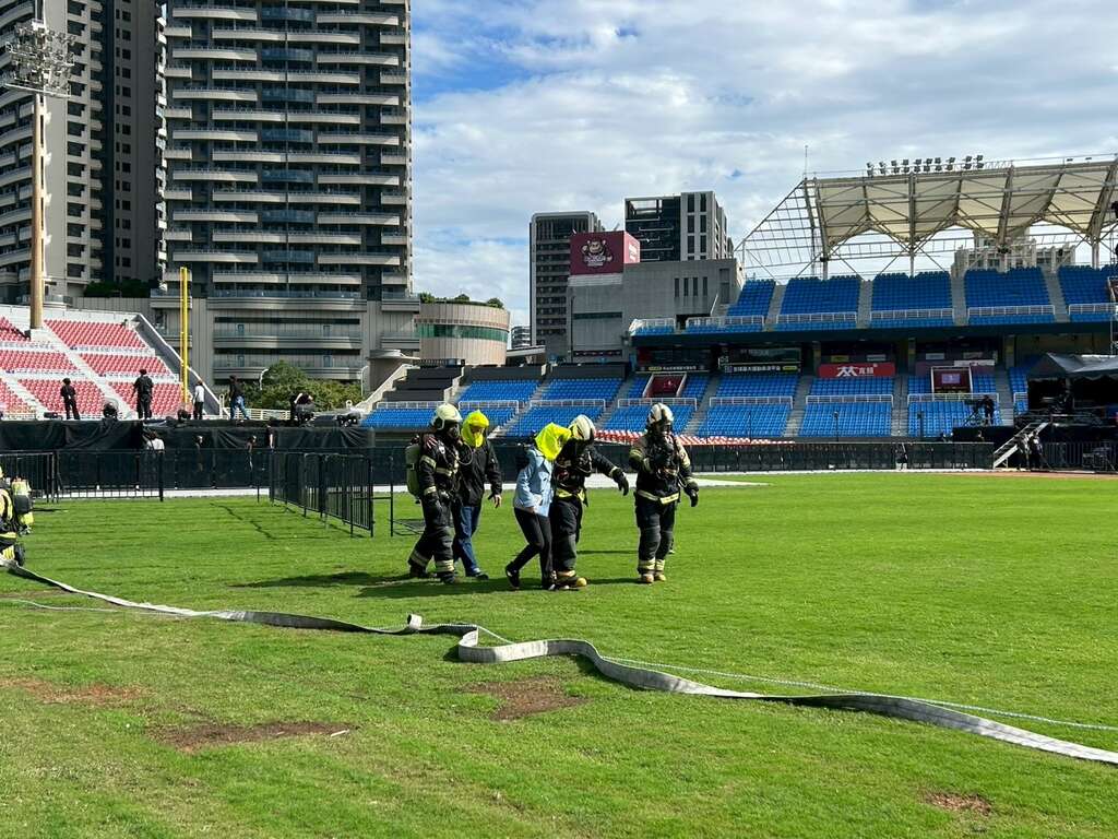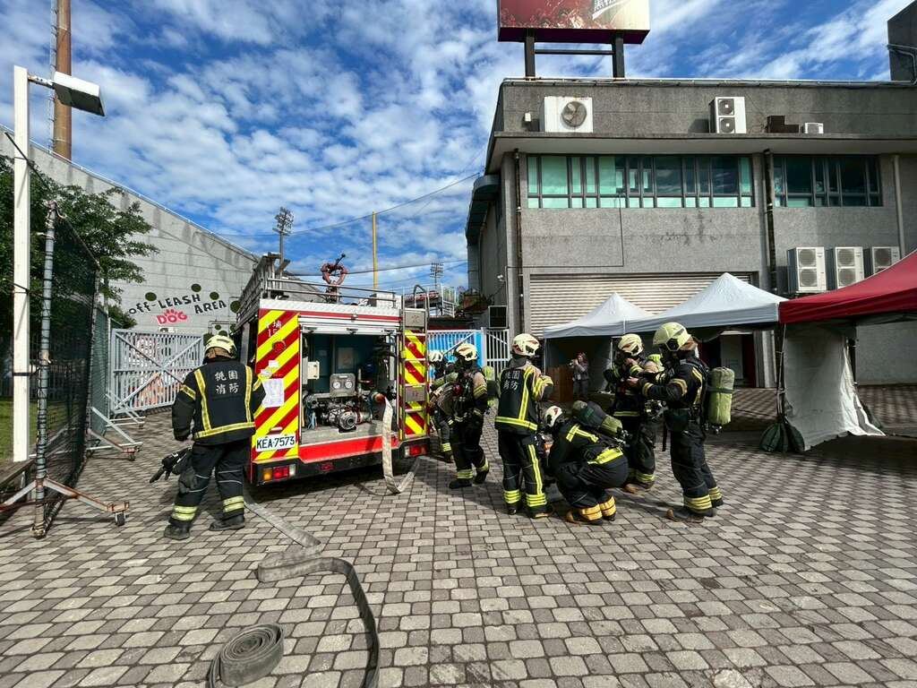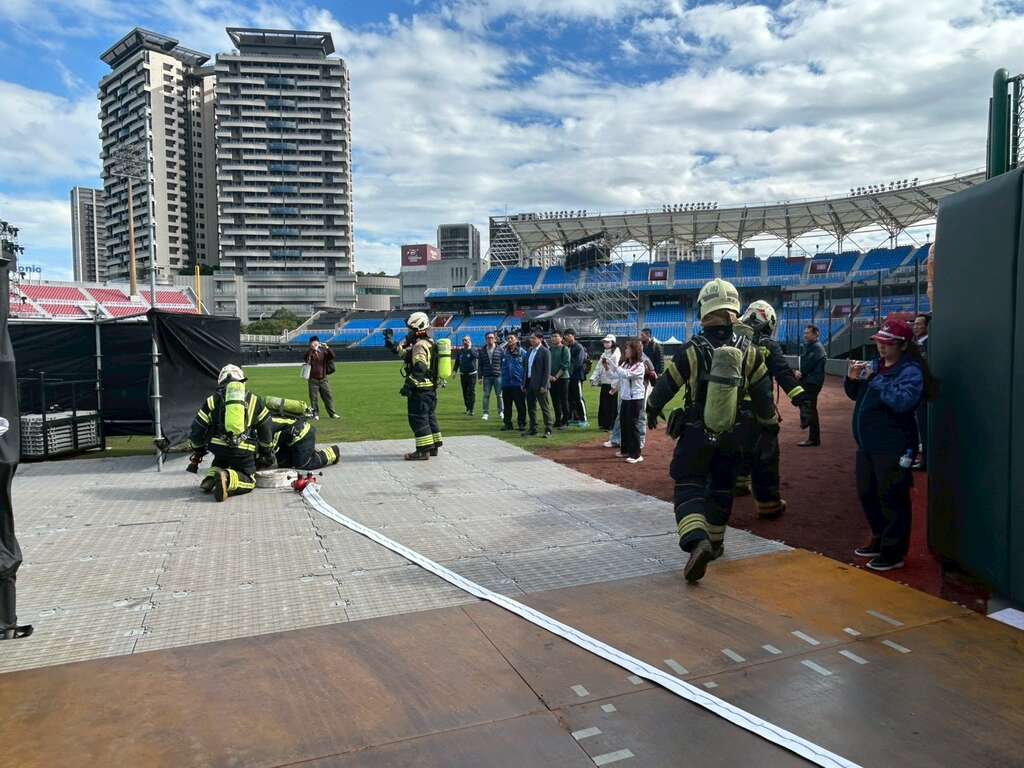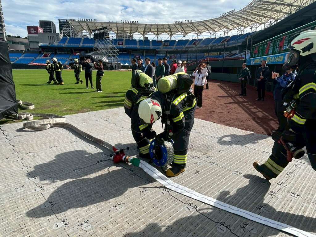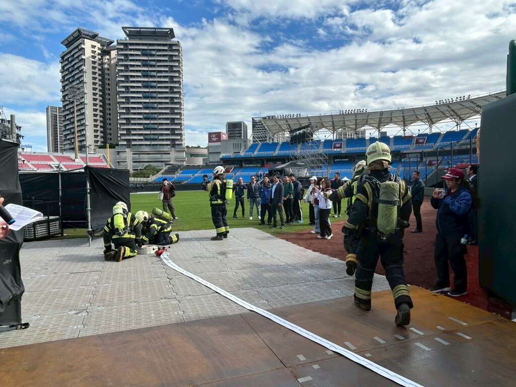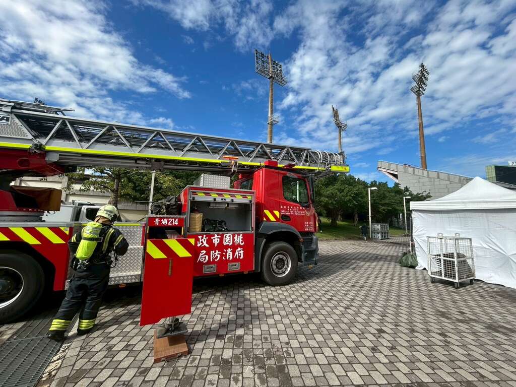 為強化大型活動期間的消防安全整備,演練首先由桃園市政府消防局青埔消防分隊於樂天桃園棒球場進行消防搶救演練。演練情境模擬跨年晚會期間,場內舞台燈光、音響等電氣設備發生短路引發火災,火勢迅速延燒並擴大,現場人員無法於第一時間控制,隨即通報119指揮中心請求支援。青埔消防分隊接獲通報後迅速抵達現場,立即完成場地平面配置確認、消防設備位置及救災動線掌握,並展開任務分工與指揮調度,同步部署水線進行滅火攻擊。