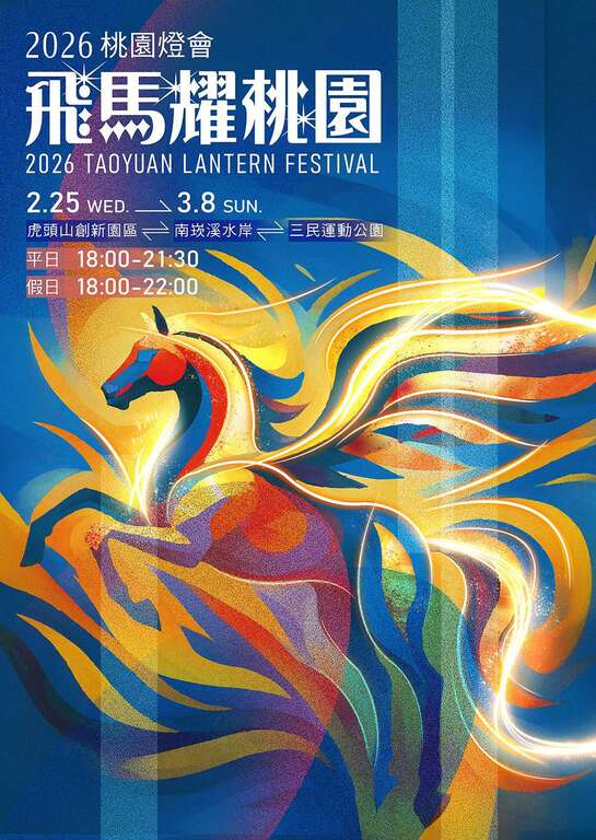 2026桃園燈會以「飛馬耀桃園」為主題,將於2月25日起至3月8日在虎頭山創新園區、南崁溪水岸及三民運動公園震撼登場,展期共計12天。本次燈會以「飛馬」生肖結合桃園航空城意象,打造高13米展翼、寬18米的全金屬機械動態主燈,並規劃三大「未來光域」、「森韻流域」、「dtto friends 樂園」三大燈區主題燈區與五感沉浸體驗,帶領民眾感受科技與藝術交織的「國門之都」。