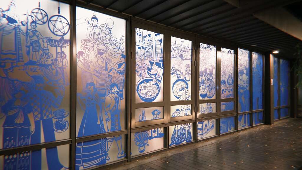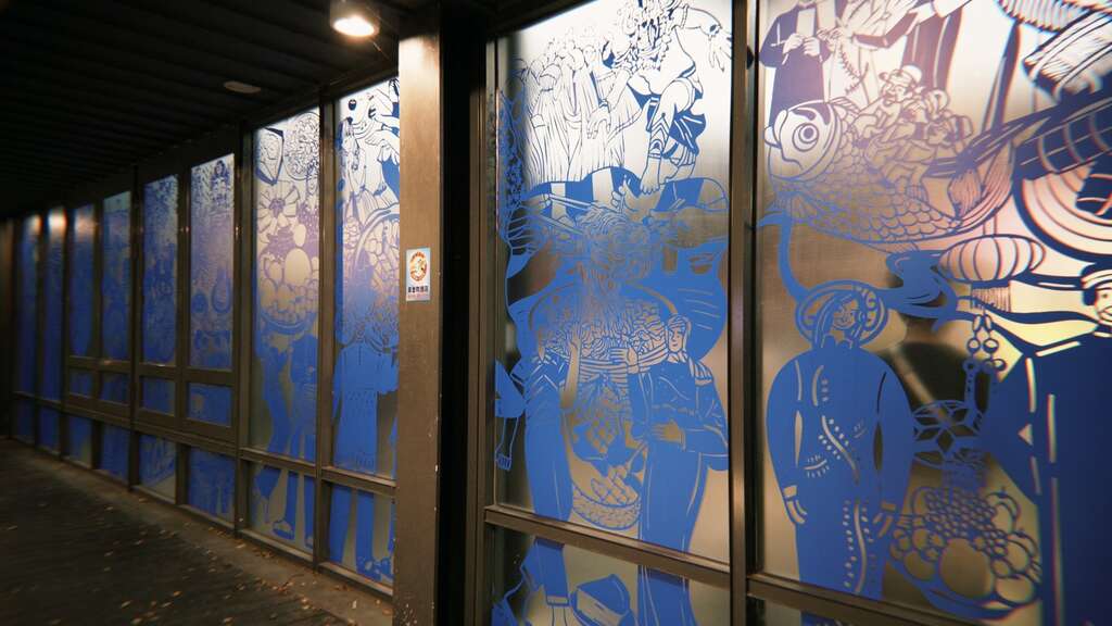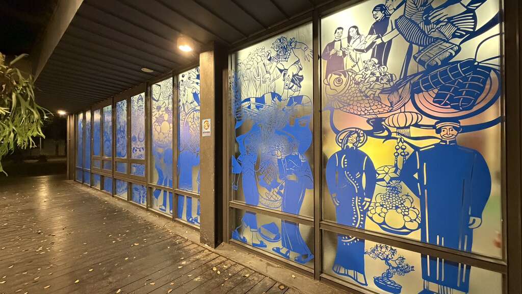 位於另一側的「豐收桃仔園」燈組,則展現了桃園身為多元族群融合城市的包容力。桃園舊稱「桃仔園」,因漢人移民開墾時遍植桃樹成林而得名。藝術家特別在玻璃屋上創作,將桃園匯聚的閩南、客家、原住民、馬祖及各國新住民文化具象化。該區細膩描繪了不同族群的節慶圖騰,包含客家收冬戲(藍黃色調)、閩南慶團圓(紅藍色調)、馬祖擺暝文化祭(紅黃色調)、雲南火把求吉(紅藍色調)以及泰雅小米豐收祭(紅黑色調),以及涵蓋越南、馬來西亞、印尼、菲律賓、港澳、中國、韓國、日本、泰國、緬甸等十個國家的文化意象。